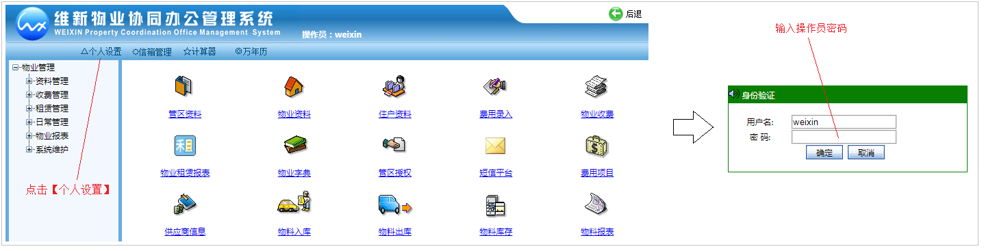 软件主页面的我的工作台是由用户自己设置的,在此简单说明如何设置。首先点击主页面左上方[设置]按钮就会弹出密码验证窗口,输入操作员自己的密码,就会进入设置窗口,如图: