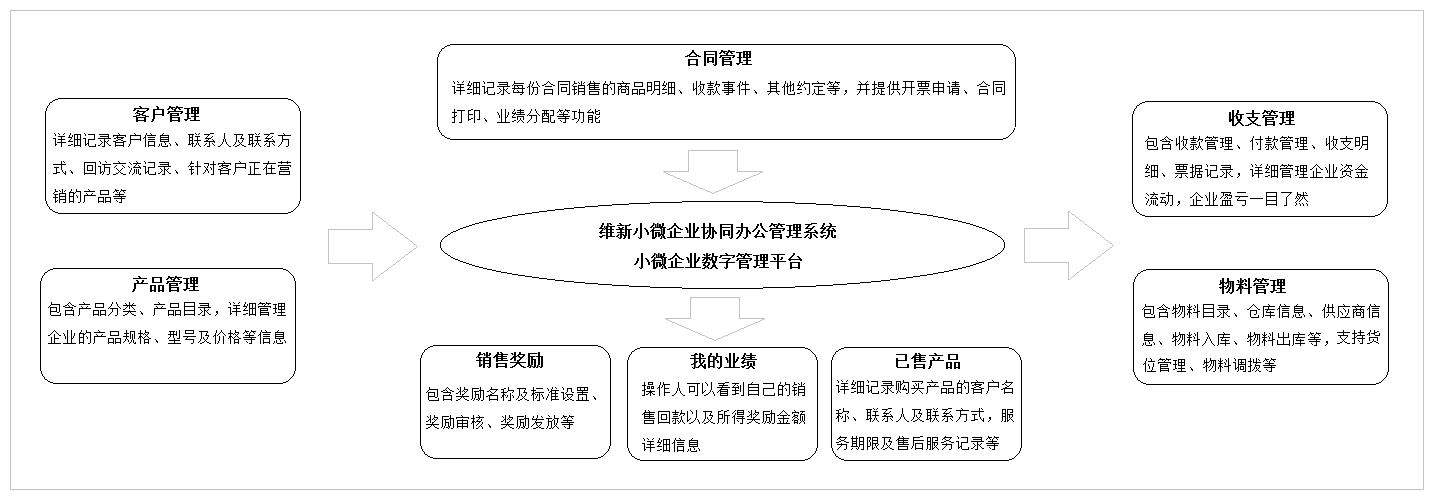 | 小微企业虽然不必像大中型企业那样组建大型企业办公平台,但为了更好地用好有限的人财物资源,更好地研发产品、开拓市场、培养团队,也需要建设一套适用的信息管理系统。维新小微企业协同办公管理系统从产品管理、客户管理、合同管理、收支管理、物料管理、售后服务等多方面将企业管理集中在一个数字平台,所有数据集中存储在一个数据库中,为企业领导和各级管理人员提供一个及时掌握业务全貌的信息处理平台。